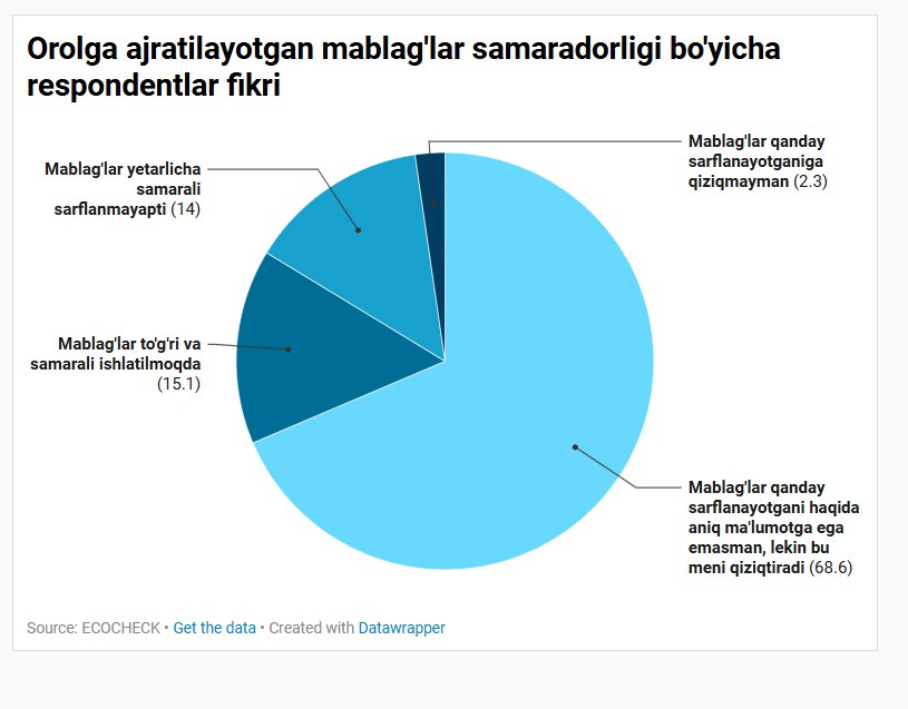 Cўровнома шуни кўрсатдики, 59 киши (68,6%) маблағлар қаерга сарфланаётгани ҳақида аниқ маълумотга эга эмас, бироқ бу мавзу улар учун қизиқ. 13 киши маблағларнинг мақсадли сарфланаётганини таъкидласа, қолган 12 киши маблағларнинг самарали ишлатилмаётганлигини қайд этди.
