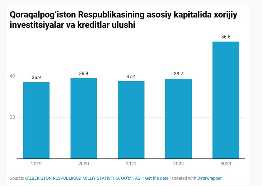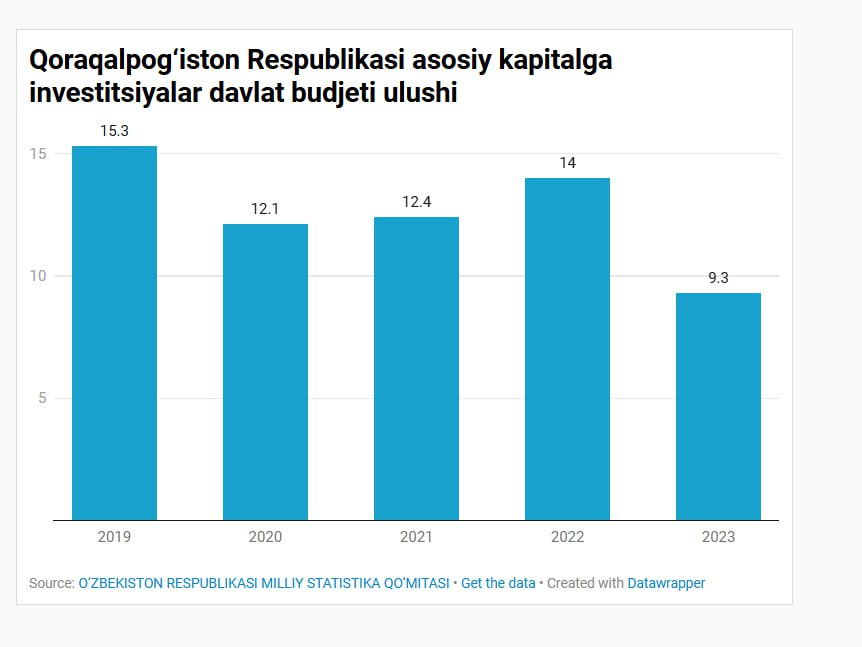 Ўзбекистон Республикаси Президенти ҳузуридаги Статистика агентлиги маълумотларига асосланиб айтиш мумкинки, Қорақалпоғистон Республикасида асосий капиталга давлат бюджети ҳисобидан йўналтирилган инвестициялар улуши 2023-йилда 9,3 фоизгача камайган.(2-график).