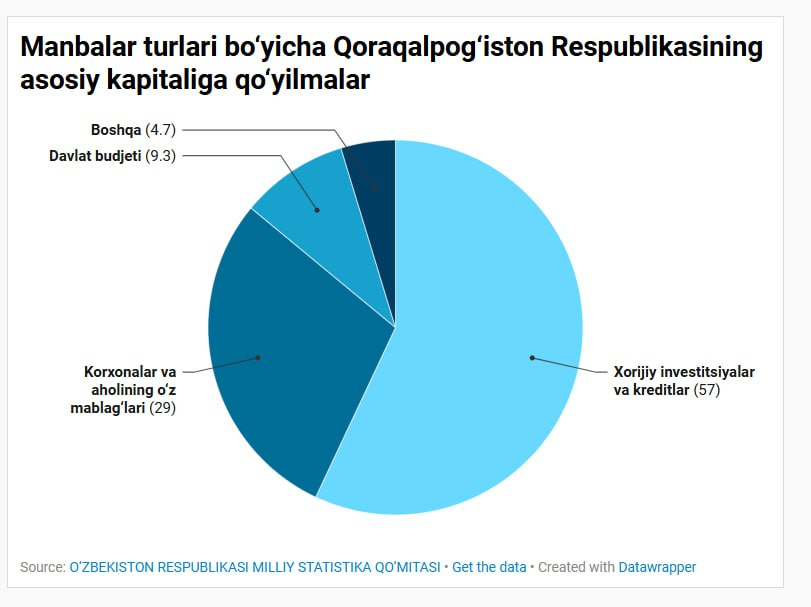 Хорижий сармоялар ва кредитлар Қорақалпоғистон Республикасининг асосий капиталига йўналтирилган инвестициялар ҳажмининг ярмидан кўпроғини ташкил этди.(4-график)
