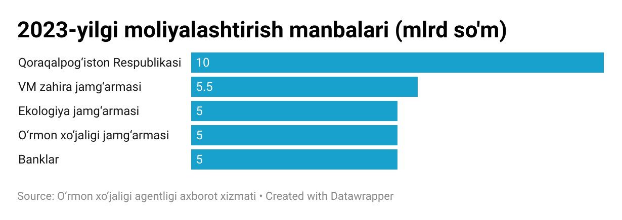 Давлат ва маҳаллий маблағлар бўйича, 2017–2021-йилларда ташаббускорлар ва тижорат банклари томонидан 200 млрд сўм ажратилган, 2023-йилда бу рақам турли манбалар ҳисобидан 30,5 млрд сўмни ташкил этган (5-график). Шу билан бирга, 2020-йилда Оролни қутқариш халқаро жамғармасига 89,55 млрд сўм, сув ҳавзалари ва ўрмонлаштириш лойиҳалари учун эса 11,3 млн сўм сарфланган.Давлат ва маҳаллий маблағлар бўйича, 2017–2021-йилларда ташаббускорлар ва тижорат банклари томонидан 200 млрд сўм ажратилган, 2023-йилда бу рақам турли манбалар ҳисобидан 30,5 млрд сўмни ташкил этган (5-график). Шу билан бирга, 2020-йилда Оролни қутқариш халқаро жамғармасига 89,55 млрд сўм, сув ҳавзалари ва ўрмонлаштириш лойиҳалари учун эса 11,3 млн сўм сарфланган.