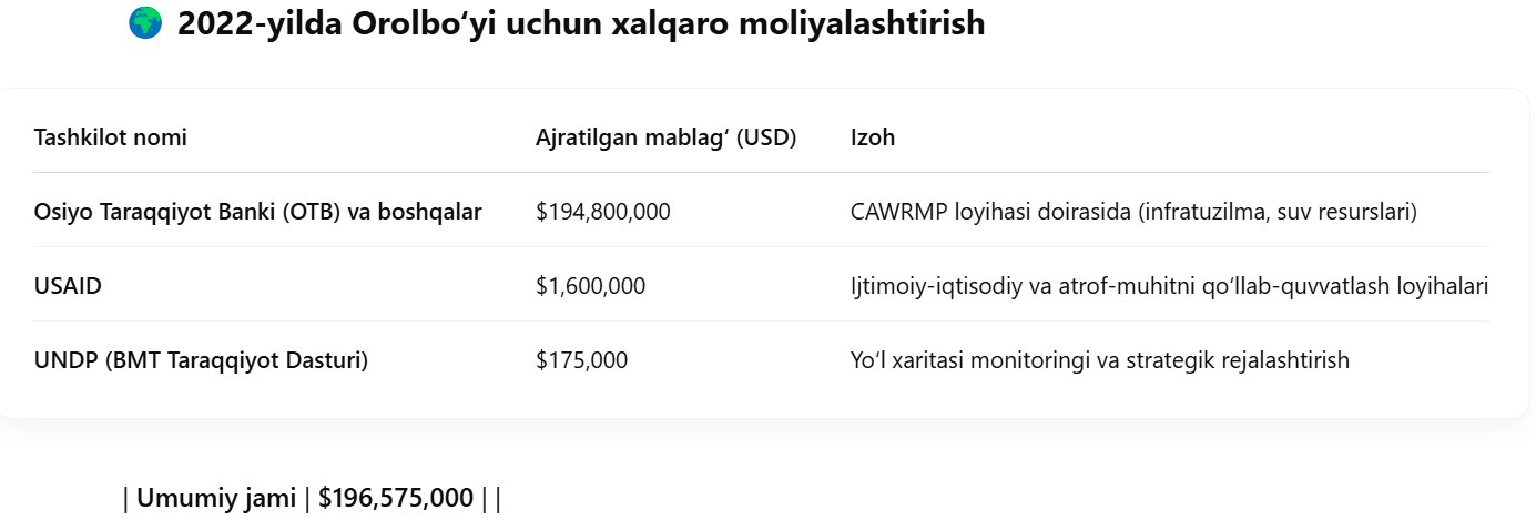 Оролбўйининг барқарор ривожланишига қаратилган молиявий сармоялар, жумладан давлат бюджетлари, халқаро грантлар ва махсус фондлар, Орол денгизининг қуриб бориши ва унинг оқибатларига юқори эътибор қаратилаётганини кўрсатади. Бироқ, катта рақамлар ортида асосий мақсадни – ушбу ҳудудда яшовчи одамларнинг ҳаёти қандай ўзгаряпти – кўриш муҳимдир. Ичимлик суви таъминоти, тиббиёт муассасаларининг қурилиши, яшил майдонларни кўпайтириш ва ижтимоий инфратузилманинг ривожланиши ижобий ўзгаришларни кўрсатмоқда.