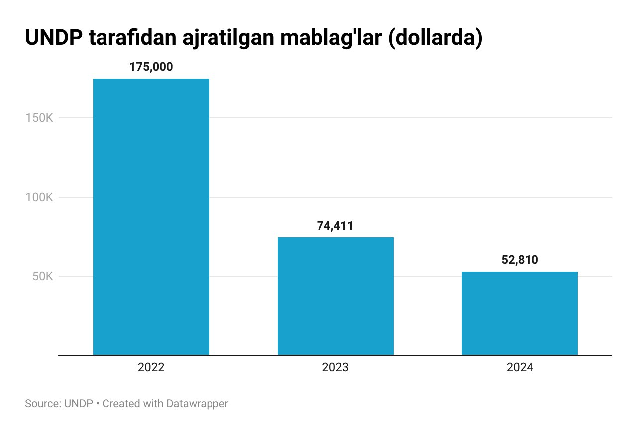 БМТ Тараққиёт Дастури (УНДП) 2022-йилда $175 минг, 2023-йилда $74 411, 2024-йилда эса $52 810 миқдорида маблағ ажратди.